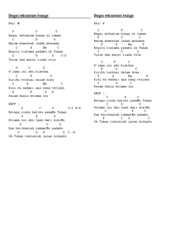 Bagai sekuntum bunga Bagai sekuntum bunga di taman Harum semerbak indah menawan Begitu cintamu padaku oh Tuhan Tulus dan murni tiada cela Slama ini aku biarkan Diriku terbuai dalam dosa Kini ku sadari apa yang terjadi Dalam dunia selama ini REFF. Bagai sekuntum bunga di taman Harum semerbak indah menawan Begitu cintamu padaku oh Tuhan Tulus. True Worship by Corr Tetelepta.