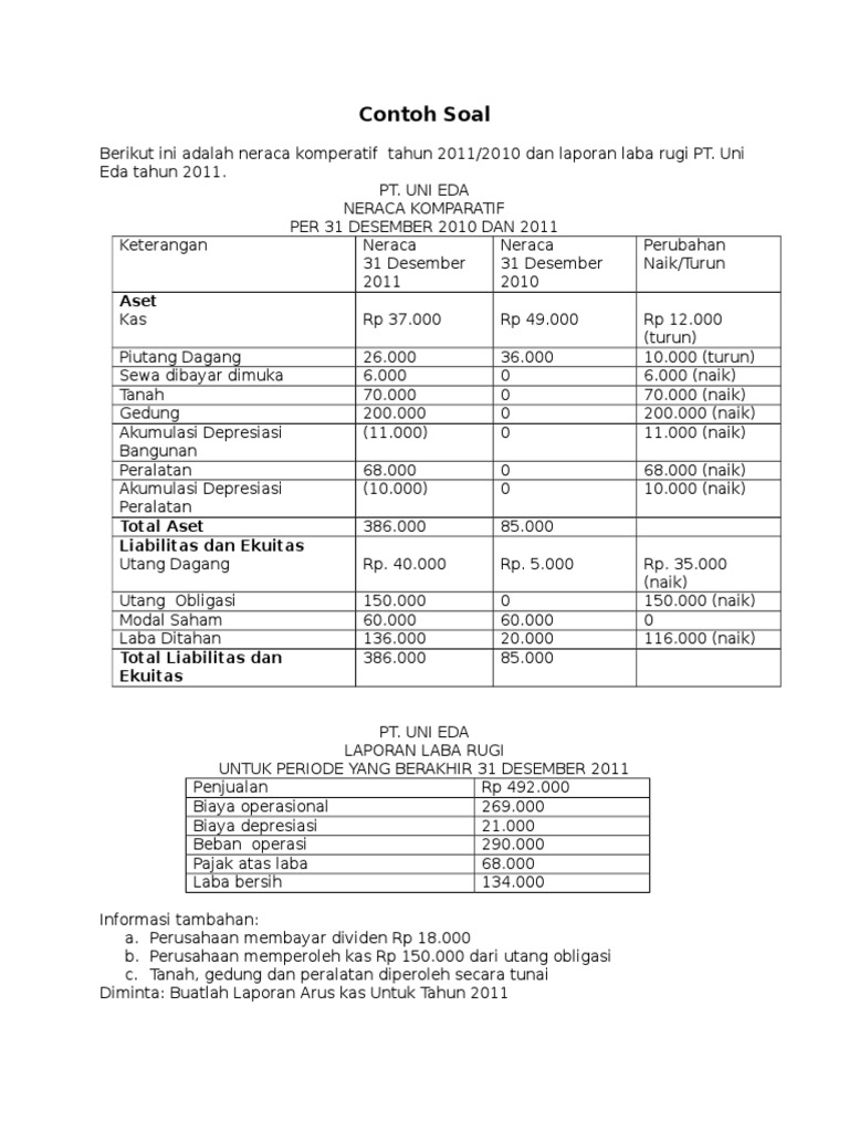 Contoh soal dan jawaban laporan arus kas pdf. Oke sekian dulu sobat semoga artikel ini menambah informasi dan wawasan kita semua dalam akuntansi jangan lupa tinggalkan komentar ya. Memberikan informasi yang menghubungkan laporan arus kas laporan laba rugi dan laporan posisi keuangan. Contoh soal akuntansi keuangan 2 departemen akuntansi feui 29 berikut adalah laporan posisi keuangan komparasi pt porori untuk tahun buku 2012 and 2011.