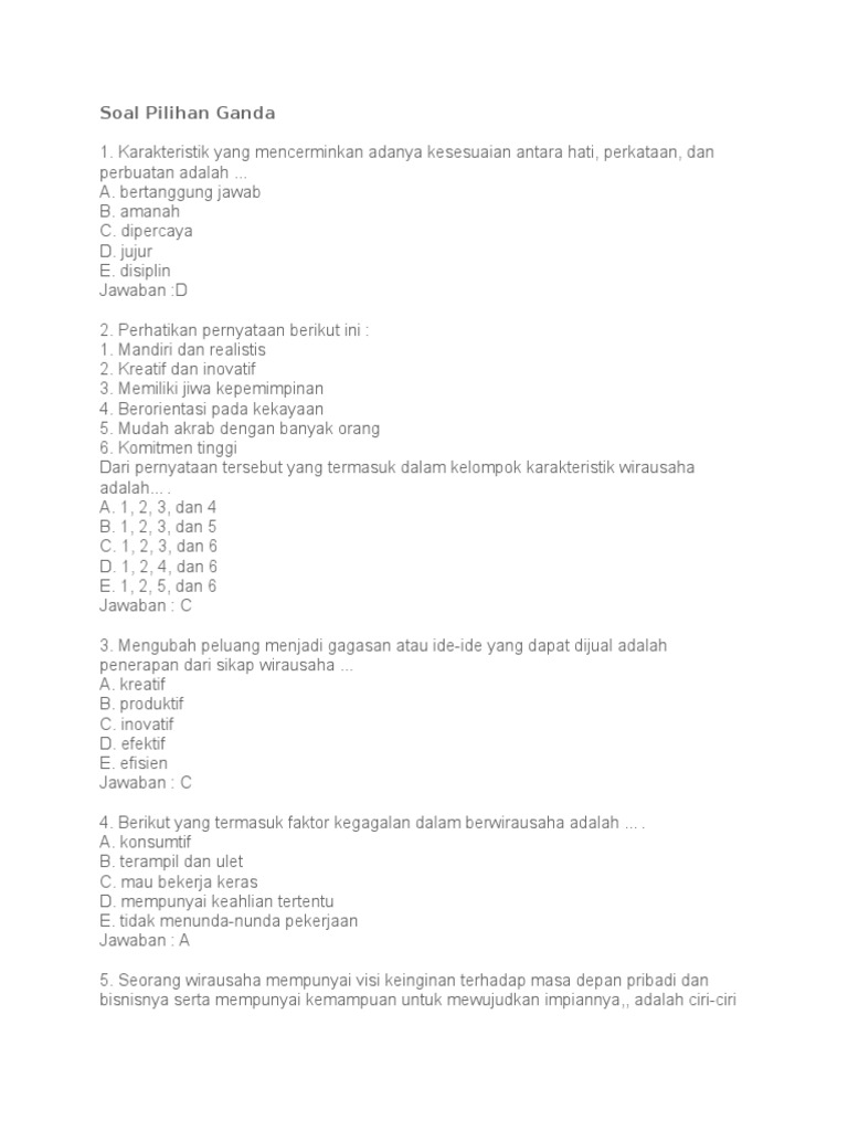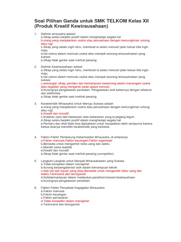 1 response to soal pilihan ganda dan jawaban pkk 4produk kreatif dan kewirausahaan peluang usaha produk barang jasa unknown 26 february 2020 at 0608 soal dan jawaban nggak ada yang sesuai dengan buku. Soal uts kwu pilihan ganda kunci jawaban kelas xii soal uts 1 kewirausahaan kelas xii smk semester 1 ta 20172018.