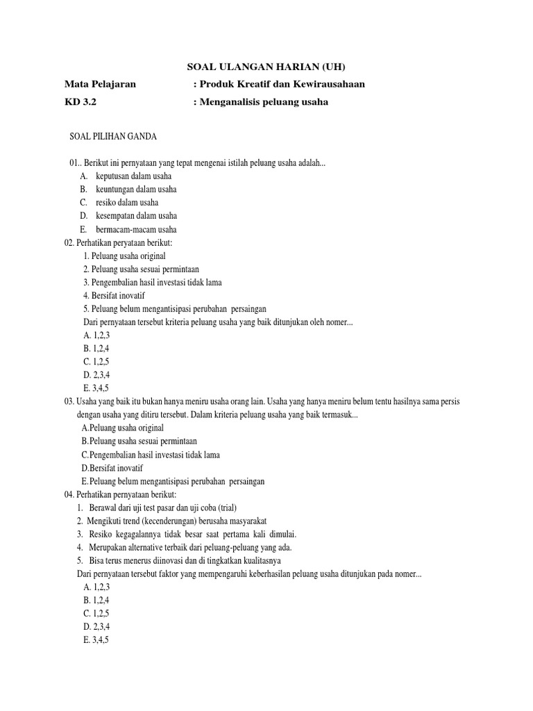 Contoh soal pilihan ganda tentang peluang usaha. Dan pada kesempatan ini saya akan menyampaikan beberapa soal pilihan ganda dan uraian untuk mata plajaran kewirausahaan tingkat SMK semester pertama atau kelas 1 semester gasal. Memiliki nilai jual yang tinggi b. Peluang Usaha Produk Barang Jasa kumpula soal produk kreatif dan kewirausahaan download Soal Pilihan Ganda.